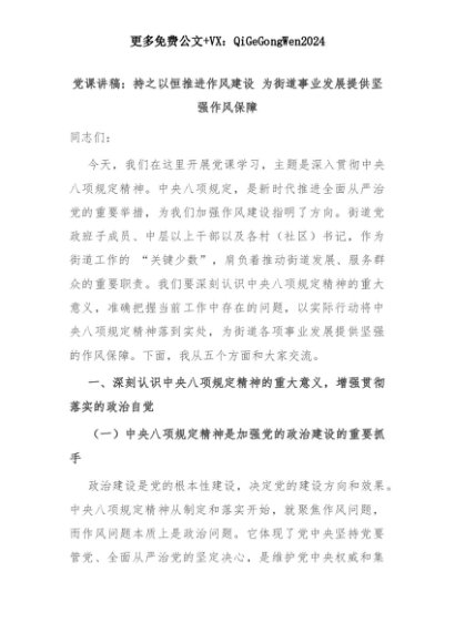 【七哥公文】2025年:党课讲稿:持之以恒推进作风建设 为街道事业发展提供坚强作风保障+更多免费公文+VX:QiGeGongWen2024+更多免费公文+VX:QiGeGongWen2024