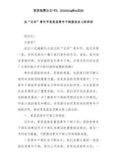 【七哥公文】2025年:在“五四”青年节某某县青年干部座谈会上的讲话+更多免费公文+VX:QiGeGongWen2024+更多免费公文+VX:QiGeGongWen2024
