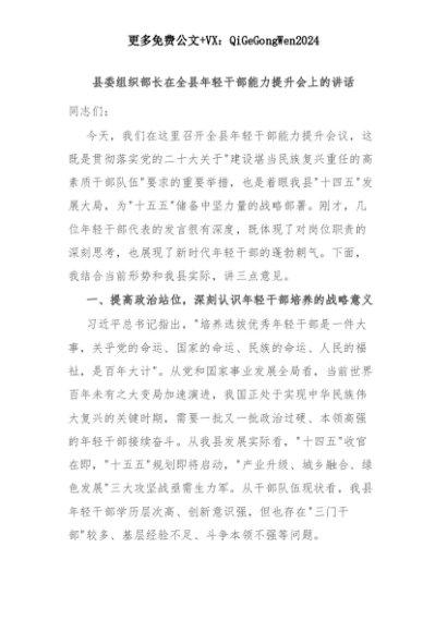 【七哥公文】2025年:县委组织部长在全县年轻干部能力提升会上的讲话+更多免费公文+VX:QiGeGongWen2024+更多免费公文+VX:QiGeGongWen2024