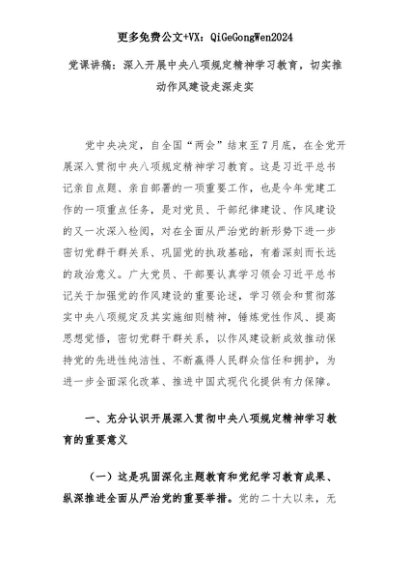 【七哥公文】2025年:党课讲稿:深入开展中央八项规定精神学习教育,切实推动作风建设走深走实+更多免费公文+VX:QiGeGongWen2024+更多免费公文+VX:QiGeGongWen2024