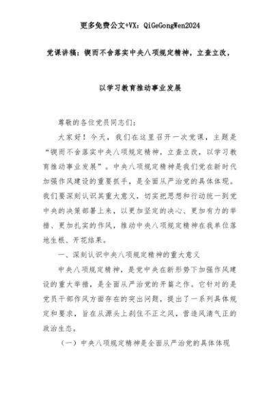 【七哥公文】2025年:党课讲稿:锲而不舍落实中央八项规定精神,立查立改,以学习教育推动事业发展+更多免费公文+VX:QiGeGongWen2024+更多免费公文+VX:QiGeGongWen2024