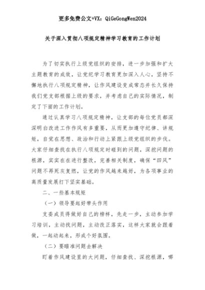 【七哥公文】2025年:关于深入贯彻八项规定精神学习教育的工作计划+更多免费公文+VX:QiGeGongWen2024+更多免费公文+VX:QiGeGongWen2024