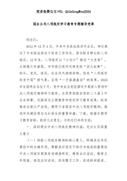 【七哥公文】2025年:国企公司八项规定学习教育专题辅导党课+更多免费公文+VX:QiGeGongWen2024+更多免费公文+VX:QiGeGongWen2024