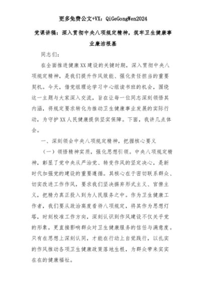 【七哥公文】2025年:党课讲稿:深入贯彻中央八项规定精神,筑牢卫生健康事业廉洁根基+更多免费公文+VX:QiGeGongWen2024+更多免费公文+VX:QiGeGongWen2024