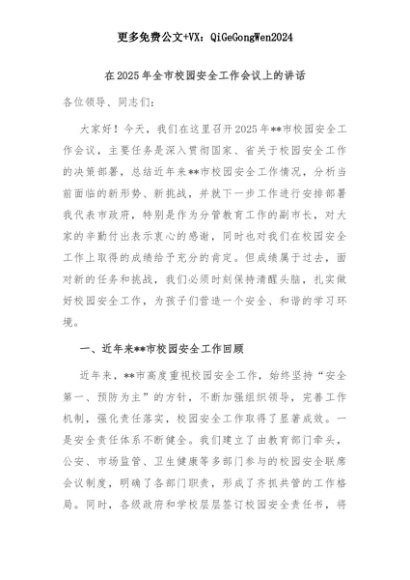 【七哥公文】2025年:在2025年全市校园安全工作会议上的讲话+更多免费公文+VX:QiGeGongWen2024+更多免费公文+VX:QiGeGongWen2024
