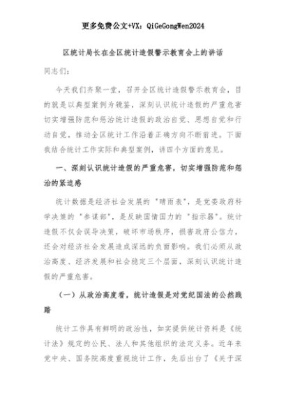 【七哥公文】2025年:区统计局长在全区统计造假警示教育会上的讲话+更多免费公文+VX:QiGeGongWen2024+更多免费公文+VX:QiGeGongWen2024