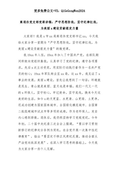 【七哥公文】2025年:离退休党支部党课讲稿:严守思想防线,坚守纪律红线,为美丽x建设贡献银发力量+更多免费公文+VX:QiGeGongWen2024+更多免费公文+VX:QiGeGongWen2024
