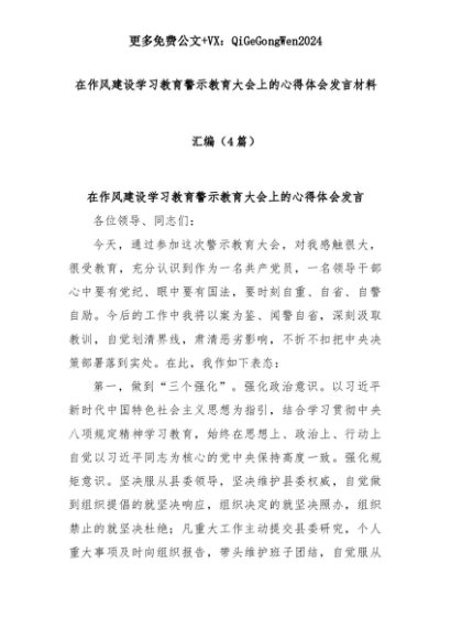 【七哥公文】2025年:(4篇)在作风建设学习教育警示教育大会上的心得体会发言材料汇编+更多免费公文+VX:QiGeGongWen2024+更多免费公文+VX:QiGeGongWen2024