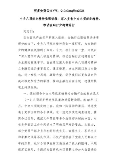 【七哥公文】2025年:中央八项规定精神党课讲稿:深入贯彻中央八项规定精神,推动金融行业稳健前行+更多免费公文+VX:QiGeGongWen2024+更多免费公文+VX:QiGeGongWen2024