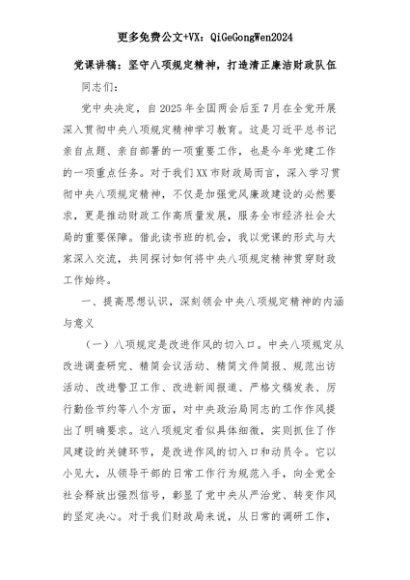 【七哥公文】2025年:党课讲稿:坚守八项规定精神,打造清正廉洁财政队伍+更多免费公文+VX:QiGeGongWen2024+更多免费公文+VX:QiGeGongWen2024