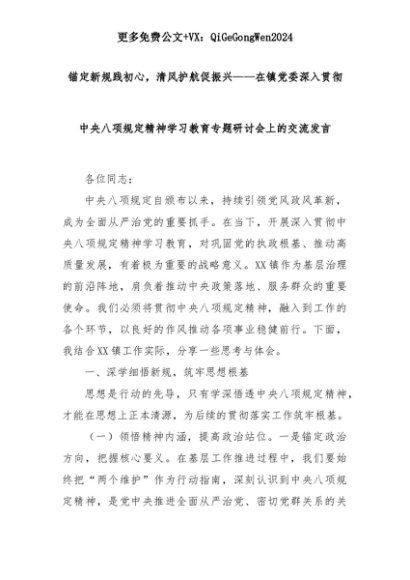 【七哥公文】2025年:锚定新规践初心,清风护航促振兴——在镇党委深入贯彻中央八项规定精神学习教育专题研讨会上的交流发言+更多免费公文+VX:QiGeGongWen2024+更多免费公文+VX:QiGeGongWen2024