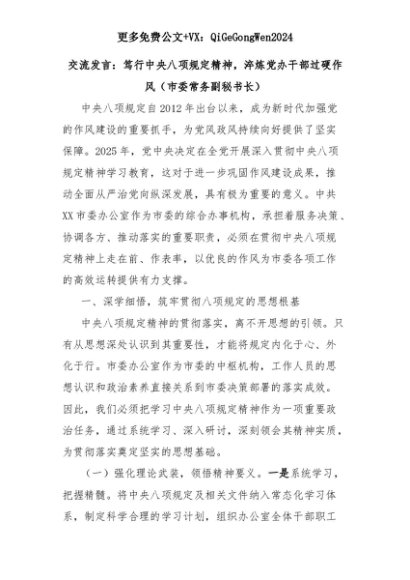 【七哥公文】2025年:交流发言:笃行中央八项规定精神,淬炼党办干部过硬作风(市委常务副秘书长)+更多免费公文+VX:QiGeGongWen2024+更多免费公文+VX:QiGeGongWen2024