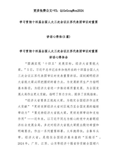 【七哥公文】2025年:(5篇)学习贯彻十四届全国人大三次会议江苏代表团审议时重要讲话心得体+更多免费公文+VX:QiGeGongWen2024+更多免费公文+VX:QiGeGongWen2024