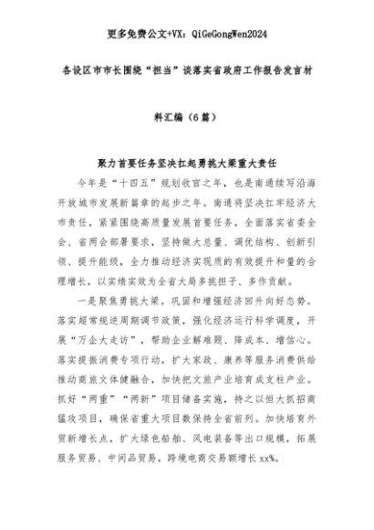 【七哥公文】2025年:(6篇)各设区市市长围绕“担当”谈落实省政府工作报告发言材料汇编+更多免费公文+VX:QiGeGongWen2024+更多免费公文+VX:QiGeGongWen2024