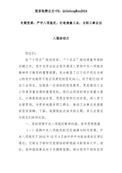【七哥公文】2025年:专题党课:严守八项规定,打造清廉工会,为职工事业注入强劲动力+更多免费公文+VX:QiGeGongWen2024+更多免费公文+VX:QiGeGongWen2024