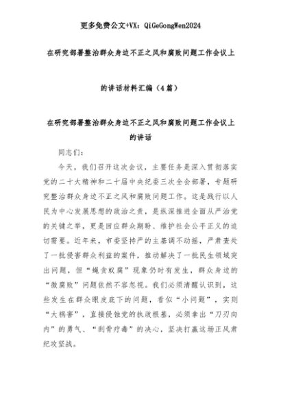 【七哥公文】2025年:(4篇)在研究部署整治群众身边不正之风和腐败问题工作会议上的讲话材料汇编+更多免费公文+VX:QiGeGongWen2024+更多免费公文+VX:QiGeGongWen2024
