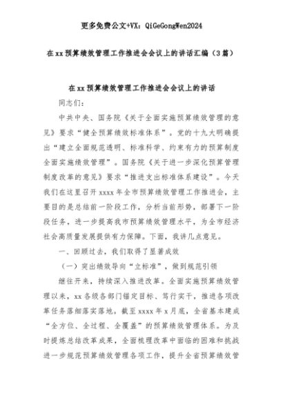 【七哥公文】2025年:(3篇)在xx预算绩效管理工作推进会会议上的讲话汇编+更多免费公文+VX:QiGeGongWen2024+更多免费公文+VX:QiGeGongWen2024