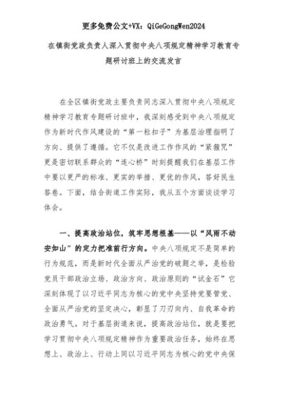 【七哥公文】2025年:在镇街党政负责人深入贯彻中央八项规定精神学习教育专题研讨班上的交流发言+更多免费公文+VX:QiGeGongWen2024+更多免费公文+VX:QiGeGongWen2024