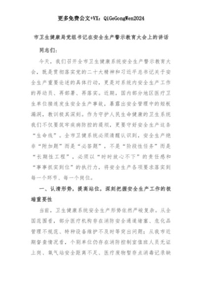 【七哥公文】2025年:市卫生健康局党组书记在安全生产警示教育大会上的讲话+更多免费公文+VX:QiGeGongWen2024+更多免费公文+VX:QiGeGongWen2024