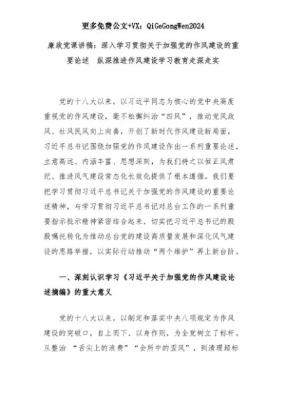 【七哥公文】2025年:廉政党课讲稿:深入学习贯彻关于加强党的作风建设的重要论述 纵深推进作风建设学习教育走深走实+更多免费公文+VX:QiGeGongWen2024+更多免费公文+VX:QiGeGongWen2024