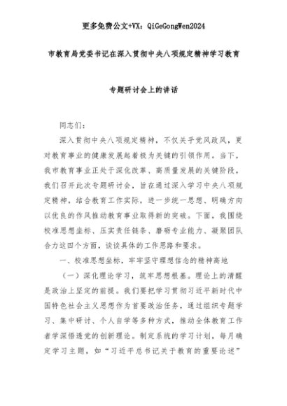【七哥公文】2025年:市教育局党委书记在深入贯彻中央八项规定精神学习教育专题研讨会上的讲话+更多免费公文+VX:QiGeGongWen2024+更多免费公文+VX:QiGeGongWen2024