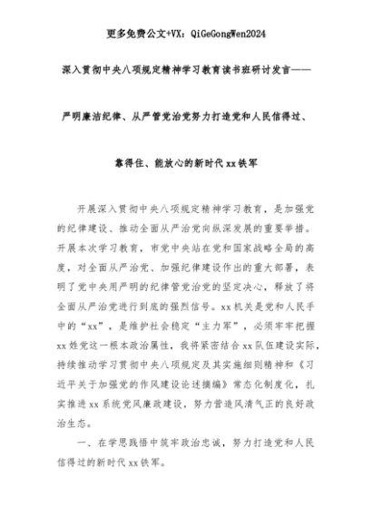 【七哥公文】2025年:深入贯彻中央八项规定精神学习教育读书班研讨发言——严明廉洁纪律、从严管党治党努力打造党和人民信得过、靠得住、能放心的新时代xx铁军+更多免费公文+VX:QiGeGongWen2024+更多免费公文+VX:QiGeGongWen2024