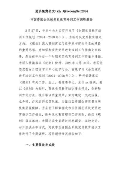 【七哥公文】2025年:市国资国企系统党员教育培训工作调研报告+更多免费公文+VX:QiGeGongWen2024+更多免费公文+VX:QiGeGongWen2024