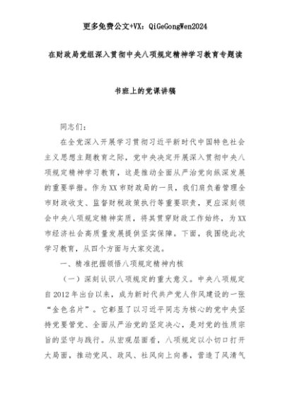 【七哥公文】2025年:在财政局党组深入贯彻中央八项规定精神学习教育专题读书班上的党课讲稿+更多免费公文+VX:QiGeGongWen2024+更多免费公文+VX:QiGeGongWen2024