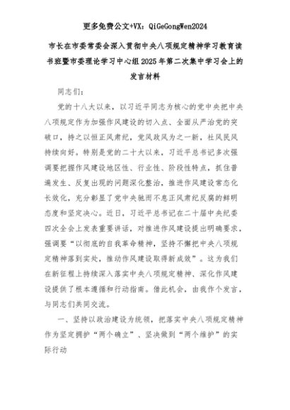 【七哥公文】2025年:市长在市委常委会深入贯彻中央八项规定精神学习教育读书班暨市委理论学习中心组2025年第二次集中学习会上的发言材料+更多免费公文+VX:QiGeGongWen2024+更多免费公文+VX:QiGeGongWen2024