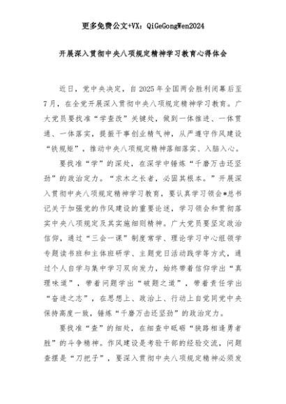 【七哥公文】2025年:开展深入贯彻中央八项规定精神学习教育心得体会+更多免费公文+VX:QiGeGongWen2024+更多免费公文+VX:QiGeGongWen2024