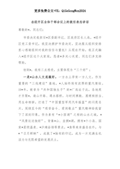 【七哥公文】2025年:在经开区全体干部会议上的就任表态讲话+更多免费公文+VX:QiGeGongWen2024+更多免费公文+VX:QiGeGongWen2024