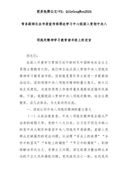【七哥公文】2025年:常务副部长在市委宣传部理论学习中心组深入贯彻中央八项规定精神学习教育读书班上的发言+更多免费公文+VX:QiGeGongWen2024+更多免费公文+VX:QiGeGongWen2024