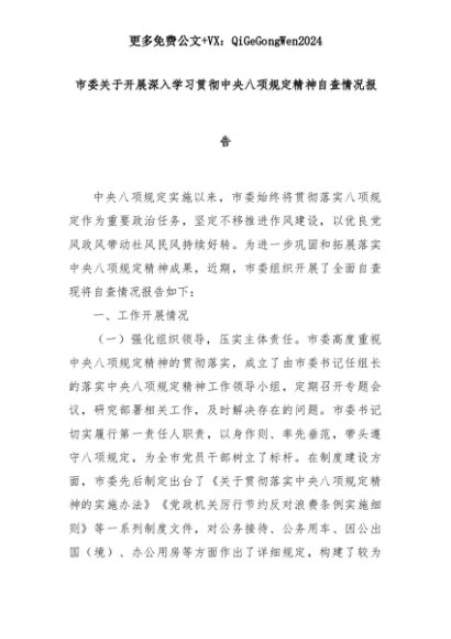 【七哥公文】2025年:市委关于开展深入学习贯彻中央八项规定精神自查情况报告+更多免费公文+VX:QiGeGongWen2024+更多免费公文+VX:QiGeGongWen2024
