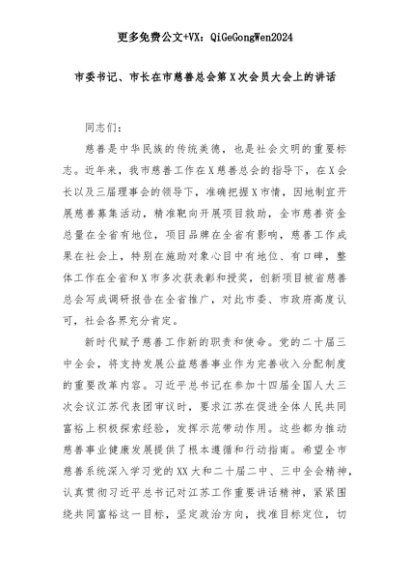 【七哥公文】2025年:市委书记、市长在市慈善总会第X次会员大会上的讲话+更多免费公文+VX:QiGeGongWen2024+更多免费公文+VX:QiGeGongWen2024