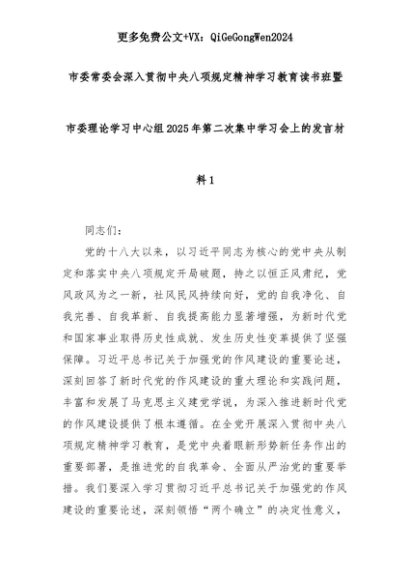 【七哥公文】2025年:市委常委会深入贯彻中央八项规定精神学习教育读书班暨市委理论学习中心组2025年第二次集中学习会上的发言材料1+更多免费公文+VX:QiGeGongWen2024+更多免费公文+VX:QiGeGongWen2024