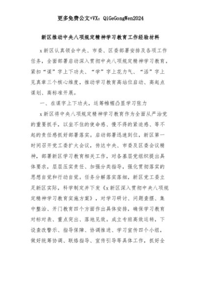 【七哥公文】2025年:新区推动中央八项规定精神学习教育工作经验材料+更多免费公文+VX:QiGeGongWen2024+更多免费公文+VX:QiGeGongWen2024