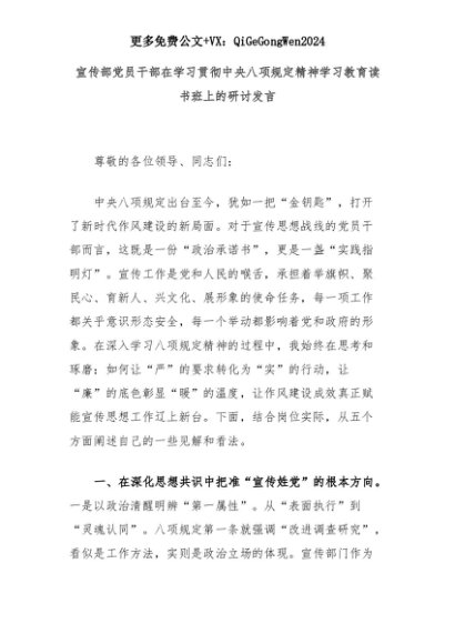 【七哥公文】2025年:宣传部党员干部在学习贯彻中央八项规定精神学习教育读书班上的研讨发言+更多免费公文+VX:QiGeGongWen2024+更多免费公文+VX:QiGeGongWen2024