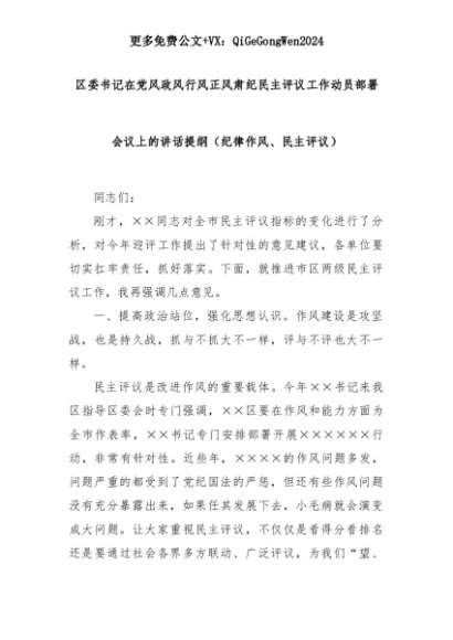 【七哥公文】2025年:区委书记在党风政风行风正风肃纪民主评议工作动员部署会议上的讲话提纲(纪律作风、民主评议)+更多免费公文+VX:QiGeGongWen2024+更多免费公文+VX:QiGeGongWen2024