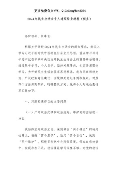 【七哥公文】2025年:2024年民主生活会个人对照检查材料(税务)+更多免费公文+VX:QiGeGongWen2024+更多免费公文+VX:QiGeGongWen2024