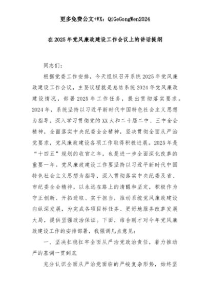 【七哥公文】2025年:在2025年党风廉政建设工作会议上的讲话提纲+更多免费公文+VX:QiGeGongWen2024+更多免费公文+VX:QiGeGongWen2024