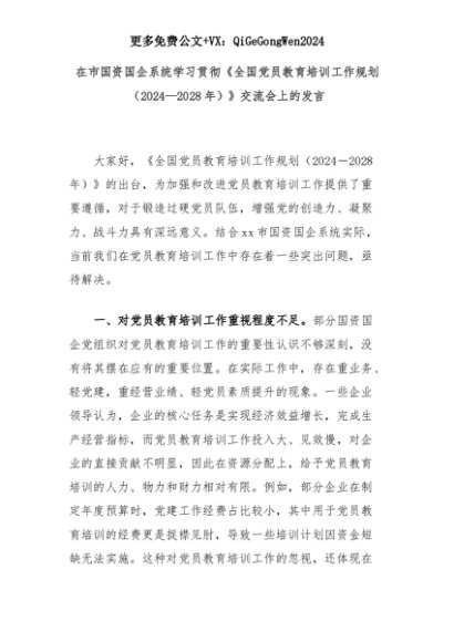 【七哥公文】2025年:在市国资国企系统学习贯彻《全国党员教育培训工作规划(2024—2028年)》交流会上的发言+更多免费公文+VX:QiGeGongWen2024+更多免费公文+VX:QiGeGongWen2024