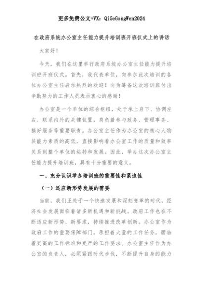 【七哥公文】2025年:在政府系统办公室主任能力提升培训班开班仪式上的讲话+更多免费公文+VX:QiGeGongWen2024+更多免费公文+VX:QiGeGongWen2024