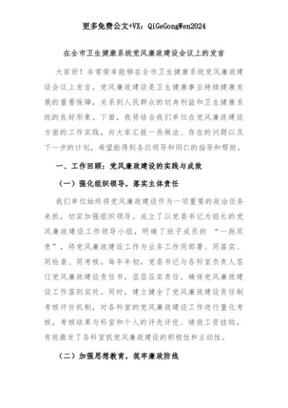 【七哥公文】2025年:在全市卫生健康系统党风廉政建设会议上的发言+更多免费公文+VX:QiGeGongWen2024+更多免费公文+VX:QiGeGongWen2024