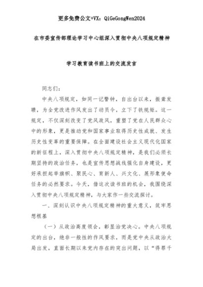 【七哥公文】2025年:在市委宣传部理论学习中心组深入贯彻中央八项规定精神学习教育读书班上的交流发言+更多免费公文+VX:QiGeGongWen2024+更多免费公文+VX:QiGeGongWen2024