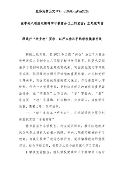 【七哥公文】2025年:在中央八项规定精神学习教育会议上的发言:立足教育管理践行“学查改”要求,以严实作风护航学校健康发展+更多免费公文+VX:QiGeGongWen2024+更多免费公文+VX:QiGeGongWen2024