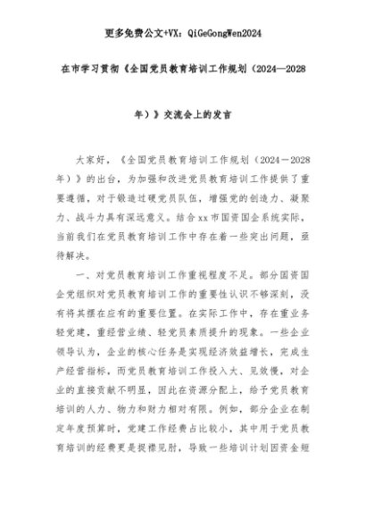 【七哥公文】2025年:在市学习贯彻《全国党员教育培训工作规划(2024—2028年)》交流会上的发言+更多免费公文+VX:QiGeGongWen2024+更多免费公文+VX:QiGeGongWen2024
