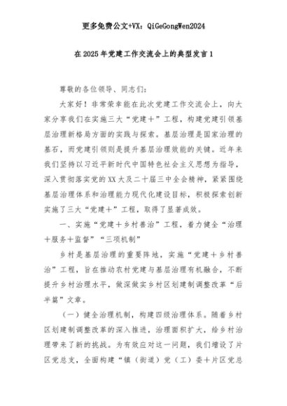 【七哥公文】2025年:在2025年党建工作交流会上的典型发言1+更多免费公文+VX:QiGeGongWen2024+更多免费公文+VX:QiGeGongWen2024