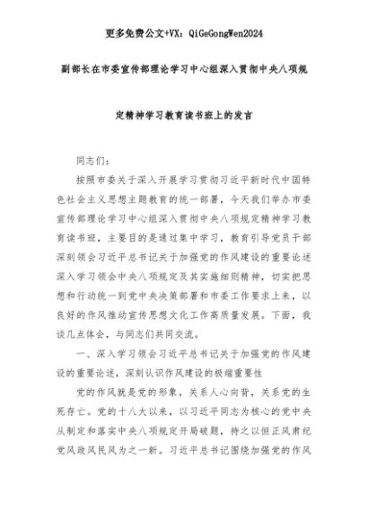 【七哥公文】2025年:副部长在市委宣传部理论学习中心组深入贯彻中央八项规定精神学习教育读书班上的发言+更多免费公文+VX:QiGeGongWen2024+更多免费公文+VX:QiGeGongWen2024