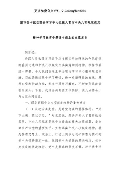 【七哥公文】2025年:团市委书记在理论学习中心组深入贯彻中央八项规定规定精神学习教育专题读书班上的交流发言+更多免费公文+VX:QiGeGongWen2024+更多免费公文+VX:QiGeGongWen2024