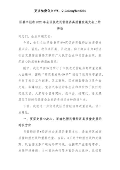 【七哥公文】2025年:区委书记在2025年全区促进民营经济高质量发展大会上的讲话+更多免费公文+VX:QiGeGongWen2024+更多免费公文+VX:QiGeGongWen2024